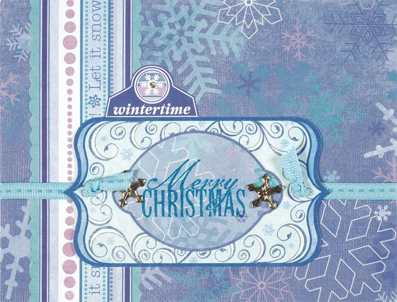 Trace and cut rounded label B from Christmas light snowflakes paper. Mat on Christmas blue paper with 1/32" borders, then stamp “Merry Christmas” on it. Glue to a blue label die cut, then insert a brad in each end. Punch a hole in each end of the die cut. Cut two 4" ribbons and knot one end of each. Thread the other end through a hole in the die cut. Glue the die cut to the front, 5/8" from the lower edge. Glue the ribbons across and under the side edges, then glue the snowflake paper edge in place. Cut out the “wintertime” Christmas art. Glue above the label and place a Dazzle™ as shown.