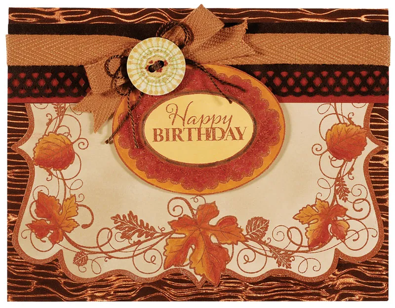 For the inside: Cut 6½"x3¾" ripple paper and glue centered on the inside. Completely ink the remaining topper section bisque, then color the leaves as described in step 3. Glue to the ripple paper, ¼" from the lower edge. Cut a 6½"x1½" sienna suede paper. Punch a border and mat it with moka suede paper as described in step 4. Glue as shown. Cut out the Color Me™ “celebrate” label and paint the center bisque, inner frame brown, and outer frame maroon. Foam tape to the border center.