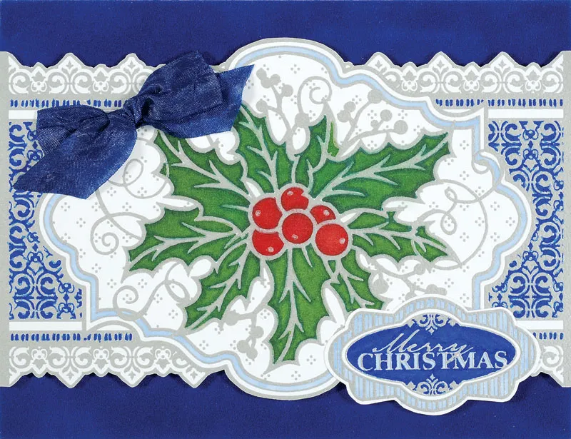Glue the topper to the center of the card. Color the label with TB6 & TB3 as shown. Glue to the lower right corner of the holly. Zot™ a small dark blue crepe bow to the top left.