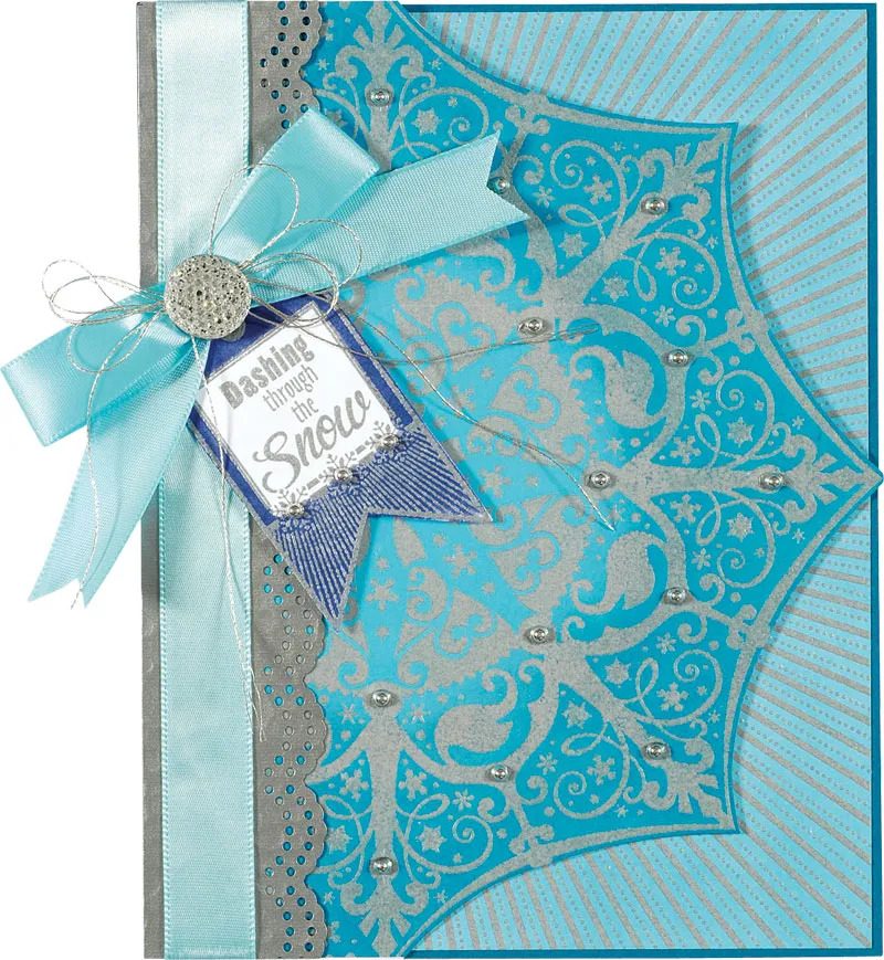 For the card front: Turn the card with the fold on the left. Cut out the Color Me™ snowflake shaped card topper. (Save the extra pieces for step 3). Use cosmetic sponges to color the center area sea crystal and the outer edges Prussian blue, blending where they overlap to eliminate harsh edges. Cut 1½"x6½" silver paper and punch a border in the right long edge. Glue along the straight edge of the card topper, then glue ribbon over the silver paper, gluing the ends to the back. Glue the topper to the front, then cut away the card front along the right edge.