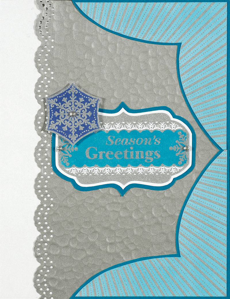 For the inside: Cut 4½"x6½" silver paper and punch a border along the left long edge. Glue to the inside, aligning the right edges. Color the remaining card topper pieces with sea crystal, then mat each on teal cardstock with 1/16" borders. Use tape to secure to the inside in the right corners.