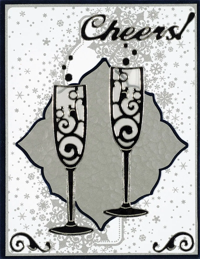Place Dazzles™ “Cheers” at the upper right and a 1" Dazzles™ swirl in each lower corner. Place the glass section of both champagne glasses on vellum and cut around the edges. Place and glue both as shown, then place Dazzles™ bubbles above the glasses.
