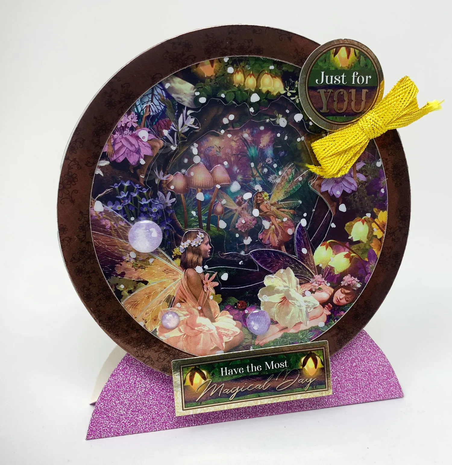 On a piece of corresponding Mirri Magic Adorable Scorable cut the two largest circle dies—one will be a ring for the top layer and the other will be a full circle with the sleeping fairy for the back of the card. Glue the last acetate circle to the back of the ring and glue to the globe. Decorate with Wishing Bubbles, small “Just for You” and “Magical Day” sentiments as shown. Zot™ yellow 1” bow as shown.