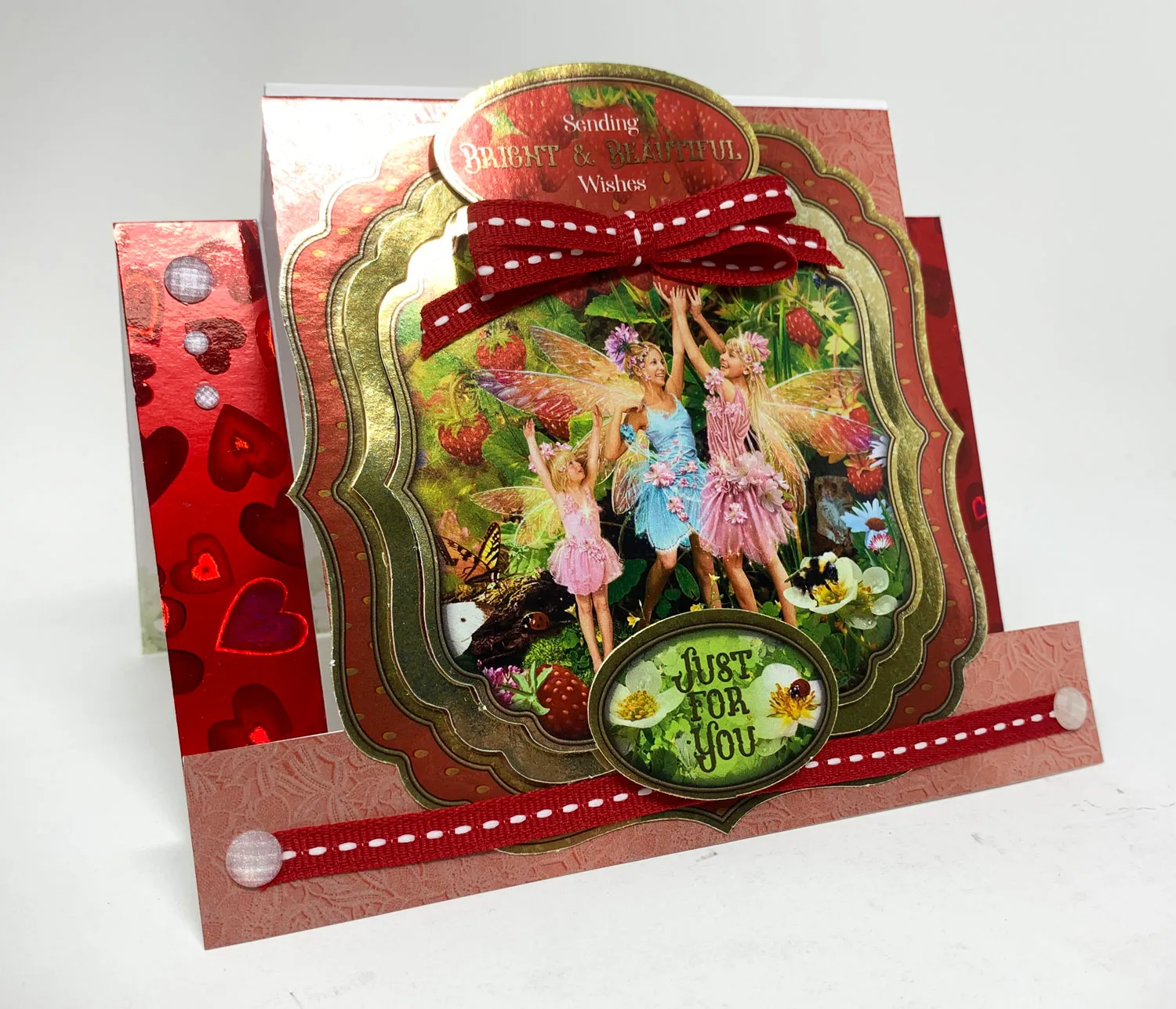 Place the Center Step die-cut card over the reverse side of the red patterned Adorable Scorable and trace the shape of the entire front panel. Cut out and glue to the card. Repeat for the side pieces using red hearts holographic cardstock.