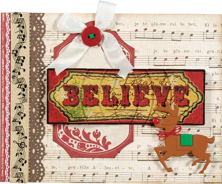Punch out the pieces for the “believe” pyramid and follow the package directions to stack them, placing foam tape between the layers. Glue across the card front as shown. Attach the brads to the reindeer Brad Buddy&trade,; hiding the prongs, then use three layers of foam tape to attach it to the card as shown. Tie a bow with the cream ribbon and glue to the tag hole. Thread 1/8" ribbon through the holes of a button and glue the ends on the back. Glue the button to the bow center.