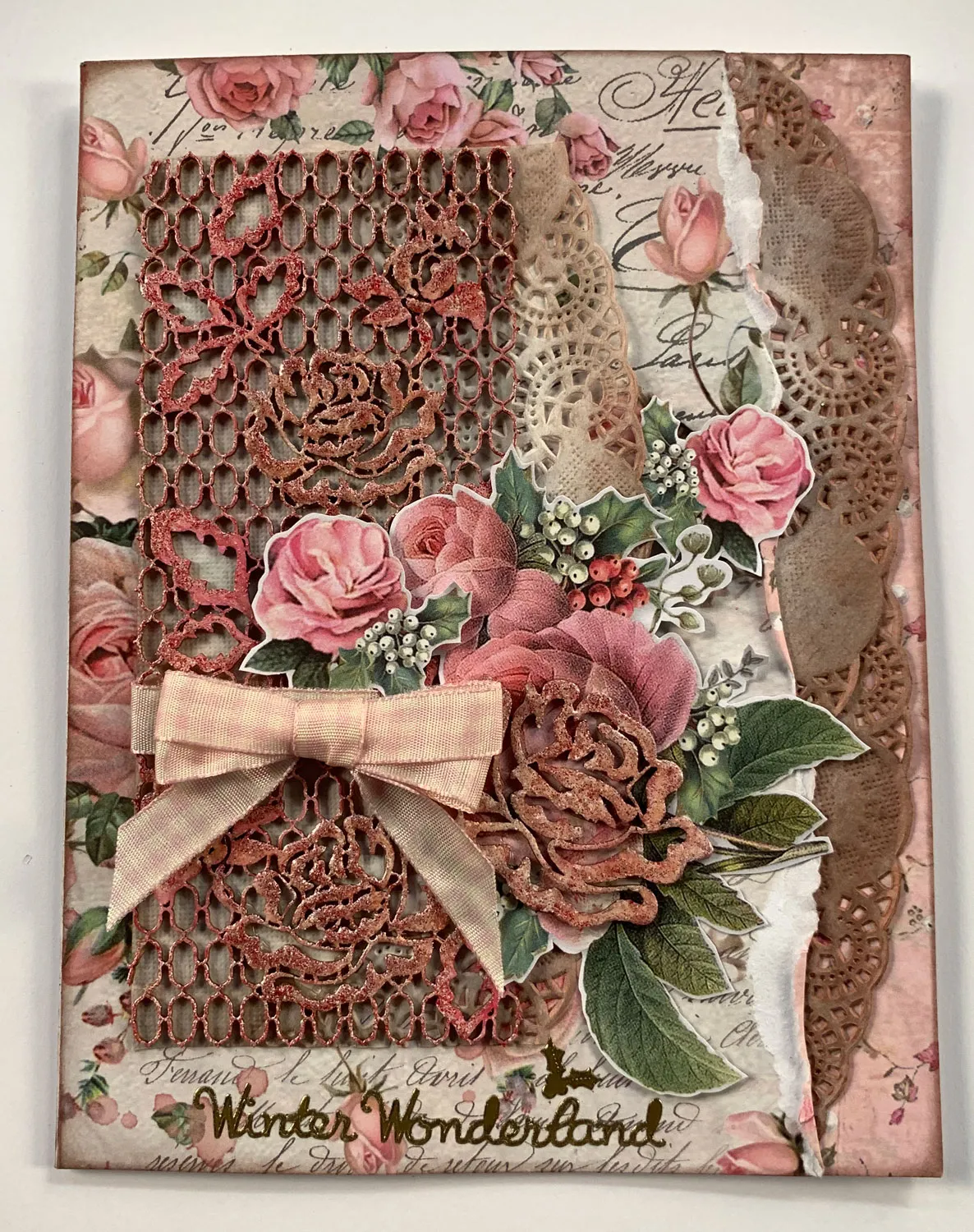 Cover the card front with the pink roses paper. Cut an oval doily into 4 pieces and go over just the edges with the Dusky Rose and Roasted Coffee ink pads. Glue two doily pieces as shown. Tear 1” from the right side of 5”x6.5” rose and script paper then glue to the front. Remove the rose trellis and 2 roses from the chipboard sheet. Cover with VersaMark and shake Azalea embossing powder over the top. Melt with heat gun. Glue ribbon around the trellis 2” from bottom and glue a bow on top. Glue the trellis chipboard over a doily section and trim the doily so only the right edge shows. Glue to the card, ½” from the fold.