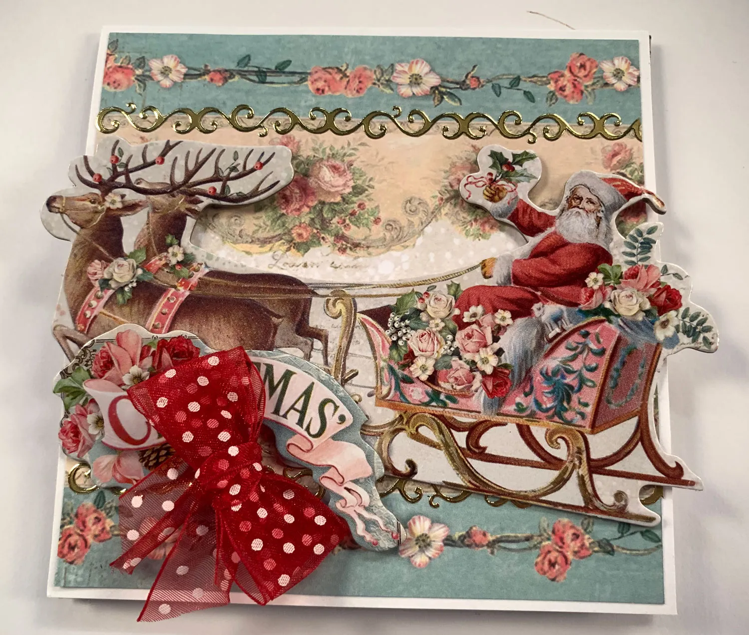Cut a blank card to 5” square card. With the fold at the top, score and fold top in half to make the easel. Cover each half with 4 ¾”x2 ¼” border Santa paper. Place gold Fancy Border Dazzles™ between the two different colored areas. With Extra Sticky Tape attach the large Santa and sleigh die cut ONLY along the bottom. Glue the Christmas die cut to the larger one and Zot™ a red bow as shown.
