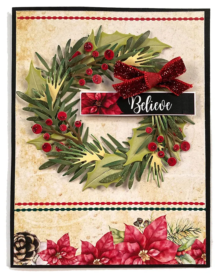 LeNae covered her 5”x6 ½” card with black Poinsettia Passion 12”x12” Solid Cardstock. She glued 4 ¾”x6 3/8” Poinsettia Passion 12”x12” Patterned Cardstock in the center. She used Foliage Toolkit Cutting Dies with Solid Cardstock and inked some with Evergreen and Olive Green ink pads. She glued and foam taped the pieces to form a wreath as shown. Red Stickles glitter glue was dabbed on the berries. She foam taped the “Believe” cutout and Zotted™ a bow from the Velvet Glitter Ribbon Set as shown. Thin Line Primary Dazzles™ stickers were placed at the top and bottom.