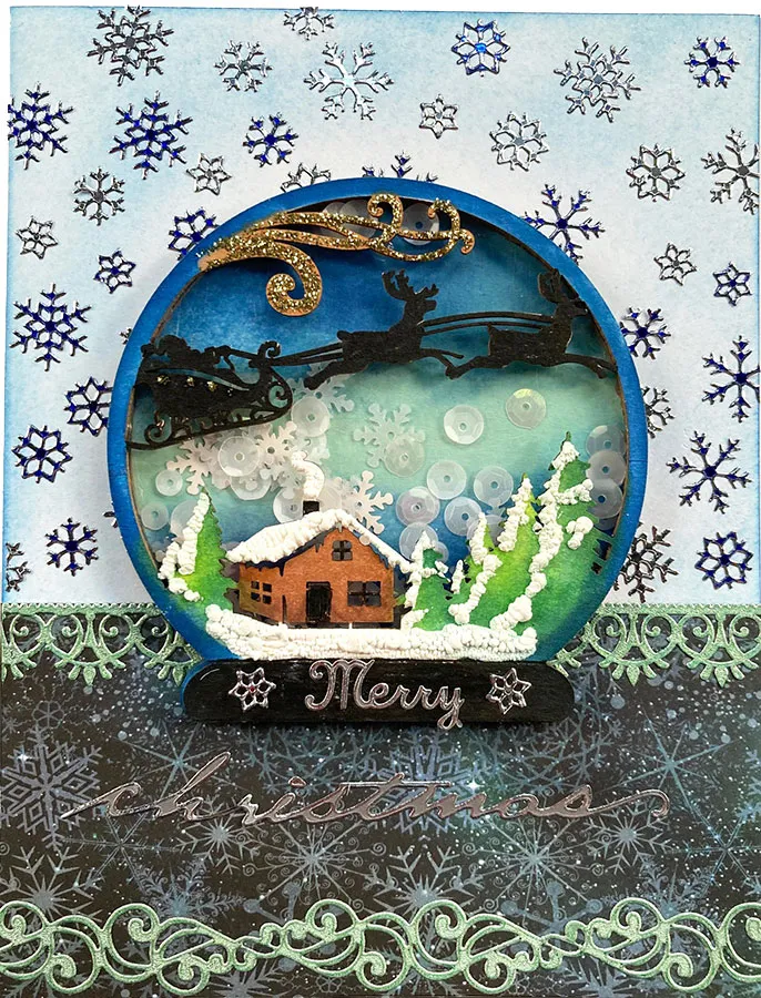 LeNae colored her 5”x6 ½” card with Blender Brushes and blue ink pad. She glued 5”x2 ½” Snowfall 6”x6” paper at the bottom. She used the Brushes with blue and green ink pads on the solid snow globe chipboard then glued it to the card. She glued two chipboard rings on top and placed Blizzard Sequins inside. She colored the last chipboard with Tri Blend Markers then made snow with Fluffy Stuff and a heat gun. She added Gold Glitter Glue on the swirls and glued the acetate shape on the back then glued the piece to the card. Snowflake Dazzles™ stickers were placed on the blue area, Fancy Border Pearl & Pastel Dazzles™ stickers were placed on the Snowfall paper and Christmas Greetings Dazzles™ stickers were the silver greetings.