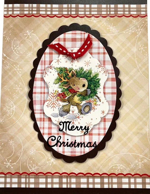 LeNae matted each long end of 5”x2” tan plaid Joyful Christmas Patterned Cardstock on black Poinsettia Passion 12”x12” Solid Cardstock. She cut it into two 5”x1” pieces and glued them at the top and bottom of the card. She glued 5”x5 ½” tan plaid in the center. She used Blender Brushes to apply brown ink pad along the tan edges. She used 12 Oval & Scalloped Die on the black and red Cardstocks then glued them together. She foam taped them to the front and foam taped a Die-Cut on top with knotted ribbon from the Red Ribbon Set on top and “Merry Christmas” from Christmas Greetings Dazzles™ stickers below. Red Thin Line Primary Colors Dazzles™ Stickers were placed at the top and bottom.