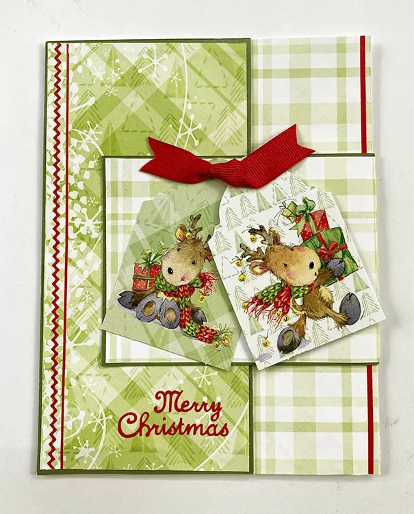LeNae cut 2” off the opening edge of her 5”x6 ½” card. She covered the front with green Poinsettia Passion 12”x12” Solid Cardstock and glued 3”x6 3/8” green Joyful Christmas 12”x12” Patterned Cardstock on top. She cut 3”x5” green Solid Cardstock, scored 1/2” from a short edge and glued the tab to the back of the card do it wrapped around to the front. She glued green Patterned Cardstock on top. Two Joyful Christmas Die-Cuts were glued and foam taped on the flap with a knotted ribbon from the Red Ribbon Set Zotted™ in place. Inside she glued 2 ½”x6 ½” green Patterned as shown. She placed Thin Line Primary Colors Dazzles™ stickers along the fold and on both long edges of the Cardstock inside the card. “Merry Christmas” from Christmas Greetings Dazzles™ stickers were placed as shown.