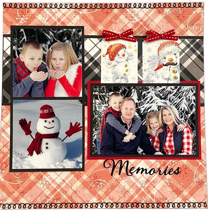 LeNae matted 12”x3 ¾” black plaid Joyful Christmas 12”x12” Patterned Cardstock on black Poinsettia Passion 12”x12” Solid Cardstock. She glued it 2” from the top of the red plaid. She matted photo on the same Solid Cardstock and glued them as shown. Border Slim Line Cutting Dies were used with black Solid and glued at the top and bottom. “Memories” from the Good Times Dazzles™ sticker collection was placed at the bottom and Two Joyful Christmas Die-Cuts were glued at the top with bows from the Red Ribbon Set.