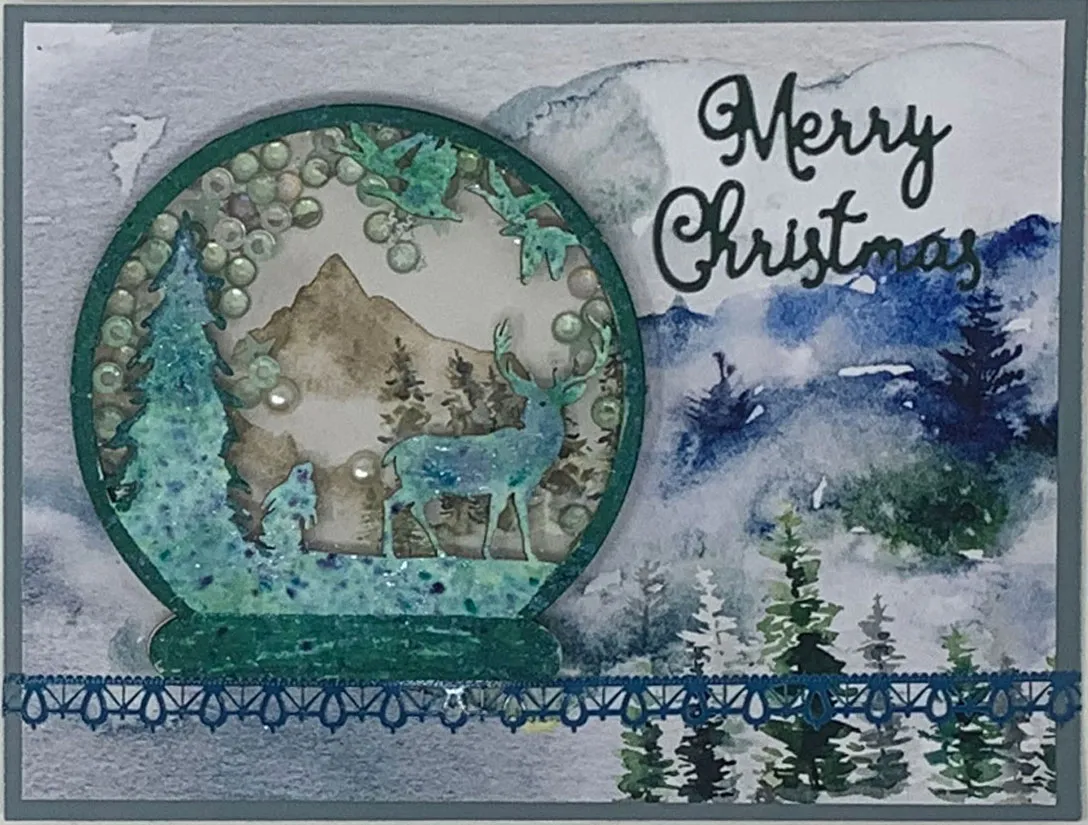 Debbie matted 6 ¼”x4 ¾” Foggy Forest 12”x12” Patterned Cardstock on Foggy Forest 12”x12” Solid Cardstock with 1/8” borders then glued it to her 6 1/2”x5” card. She colored the circle and base of the chipboard with Jade Green Tri Blend Marker. She used Green Bay Pixie Sparkles with misted water for the tree and animals. She covered the full circle chipboard with a scene from the Patterned Cardstock then glued it to the card. She glued two chipboard rings on top and added Winters Evergreen Sparkletz inside. She glued the acetate circle behind the forest chipboard then glued it on top. A blue Fancy Border Primary Dazzles™ stickers was placed under the snow globe and a green greeting from the Merry Christmas Dazzles™ stickers finished the card.