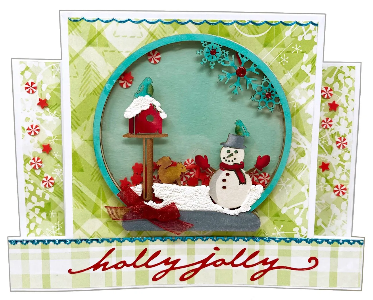 LeNae used a Center Step Die-Cut Card and covered the front and sides with Joyful Christmas 12”x12” Patterned Cardstock. She colored the chipboard with Tri Blend Markers then used Fluffy Stuff and a heat gun to make the “snow.” She colored the solid globe with a Blue Turquoise Marker then glued it to the card. She glued two chipboard rings on top and placed some Very Cherry Sprinkletz inside. She glued the acetate shape to the back of the snowman and glued the piece to the top. She added Thin Line Colorful Dazzles™ stickers to the top and bottom with Christmas Greetings Dazzles™ stickers for “holly jolly.” She dropped dots of Specialist Glue on the sides and placed Sprinkletz as shown. A bow from the Red Ribbons set and Red Glitter Jewel Dazzles™ stickers (in the snowflakes) finished the card.