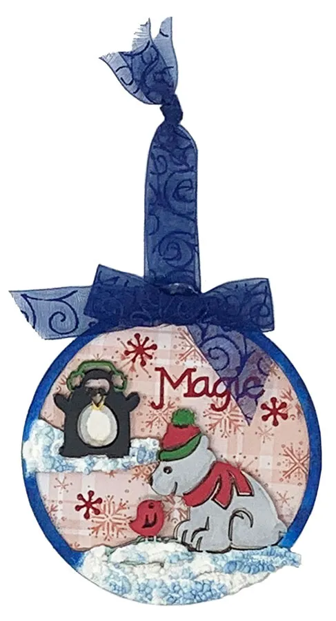 Debbie made a single-sided ornament but she could have glued made it double sided or added it to a card or tag. She colored the chipboard with Tri Blend Markers as shown then glued a single bird on top of the original bird. She spread Fluffy Stuff for snow and puffed it with a heat gun then added True Blue Tri Blend Marker ink on top. She glued Joyful Christmas 6”x6” Patterned Cardstock to the back with Christmas Greetings Dazzles™ stickers as shown. The hanger is from the Blue Ribbons Set.
