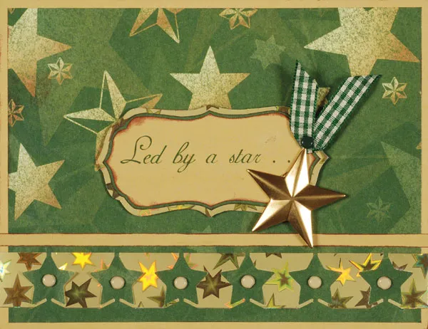 Cut a 7"x13/16" strip of gold Holographic Stars paper and thread it behind the punched stars. Insert an ivory brad in the center of each star. Glue the green/gold stars piece centered on the card, then trim the excess gold off each side. Cut a 6½"x3/16" strip of gold paper, ink the edges, and glue to the card above the stars.