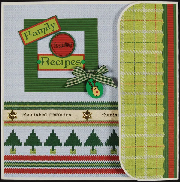 Cover a slide mount with green corduroy paper. Wrap a 1" dark green gingham ribbon length around the side at the lower right and glue the ends at the back. Glue the slide mount to the border paper, 1" from the left edge and ¾" from the top. Print “Family” and “Recipes” on green paper. Cut the “Recipes” to 2"x 5/8" and mat on red corduroy paper. Glue inside the slide mount as shown, then secure with a green square brad on each end. Glue the constructed front centered on the portfolio front.