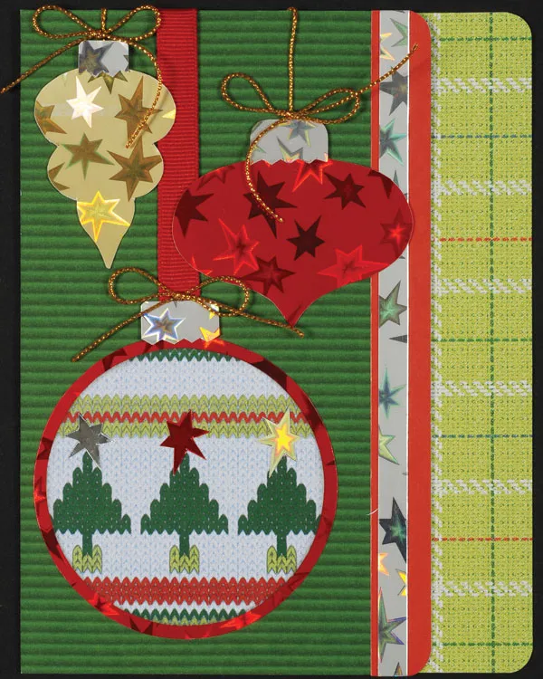 Repeat Step 3 with the smaller ornaments, positioning them as shown. Use gold thread in place of the ribbon and a small ornament top on the skinny ornament. Tie three shoestring bows with gold thread and glue to the ornaments as shown. Glue the constructed front on the blank card. Cut out one red and two silver holographic stars and glue to the treetops as shown.