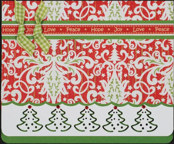 Cut out the “hope, joy, love…” border and mat it on white paper with 1/16" borders. Mat again on green cardstock with 1/8" borders, the glue it ¾" from the upper edge. Knot two 3" green gingham ribbon lengths and glue to the border near the left end. Add a crystal to each treetop.