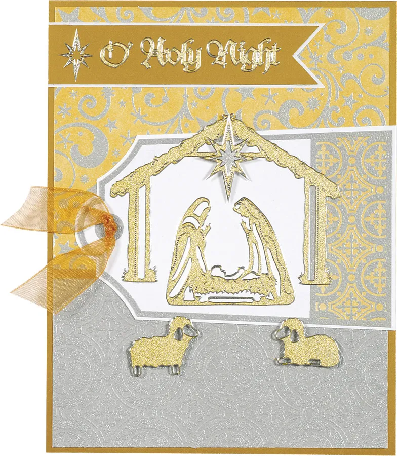 Cut out the 4½" Color Me™ circles tag and ink the circles area gold. Mat on white cardstock with 1/32" borders. Place the stable and people Dazzles™ on the tag as shown. Ink a 1" square of Color Me™ circles paper silver, then place the large star Dazzle™ on it. Cut around the edges, then foam tape to the tag as shown. Glue the tag to the card, aligning the right edges. Knot a 4" gold ribbon and glue over the tag hole. Foam tape the sheep below the tag as shown. Place a star and “O Holy Night” Dazzles™ on gold paper, then cut into a 3 7/8"x 7/8" banner. Mat on cardstock with 1/32" borders and glue as shown.