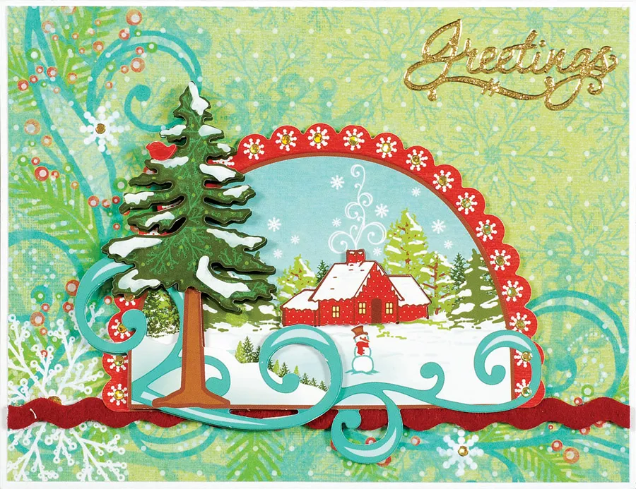 For the card front: Turn the card with the fold at the top. Cut 6¼"x4¾" Winter Delights green paper with the swirl design at the lower left. Glue felt rickrack across the paper, ½" from the lower edge, then glue the paper centered on the card. Punch out the snow scene die-cuts and follow package directions to assemble, placing foam tape between layers. Foam tape to the card, positioned over the rickrack upper edge as shown. Place “Greetings” Dazzles™ at the upper right and the jewel Dazzles™ as shown.