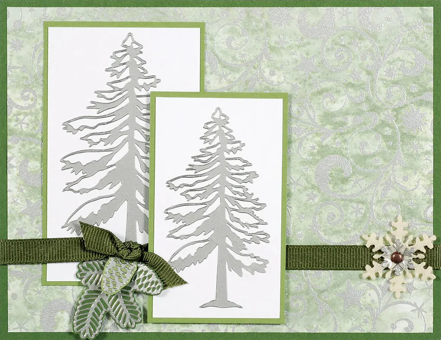 Place the 3" and 3½" tree Dazzles™ on white cardstock. Trim the larger tree to 3¾"x2¼" and the smaller tree to 3¼"x1 7/8". Mat both on light green cardstock with 1/16" borders. Glue the large tree 5/8" from the left edge, tucked under the ribbon. Wrap and tie ribbon around the first ribbon as shown, then foam tape the smaller tree beside it. Stack a snowflake Dazzle™ on a felt snowflake and secure with a brad. Glue to the ribbon near the right edge. Place a pine sprig Dazzle ™ on medium green cardstock and a pinecone on light green cardstock. Cut around each. Glue the sprig under the knot, then foam tape the cone over it as shown.
