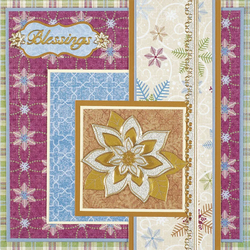 Cut 1½"x5" Winter Flannels tan snowflakes paper and mat the long edges on blue cardstock with 1/32" borders, then on gold paper with 1/8" borders. Glue vertically, 5/8" from the right edge. Assemble a 2" Dazzles™ poinsettia on gold paper, using just silver and gold pieces, then cut close to the edges.