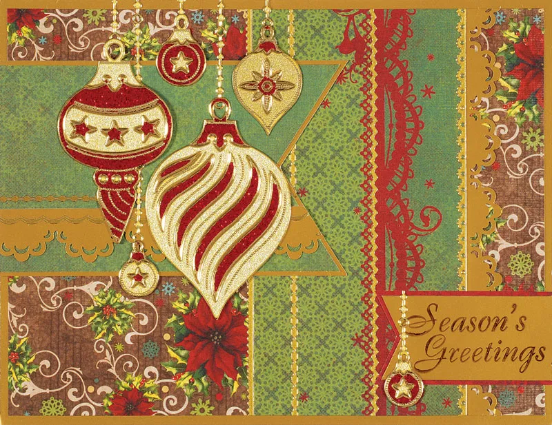 Assemble the Dazzles™ ornaments shown on gold paper, using just gold and red pieces. Cut out and glue over the banner as shown, placing border pieces as hangers. Use the pattern to trace and cut a small banner from gold paper. Mat on Vintage Christmas red paper with 1/32" borders, then stamp “season’s greetings” on it. Glue to the lower right. Assemble a Dazzles™ small ornament on gold paper, cut out, then glue it and place a border hanger as shown.