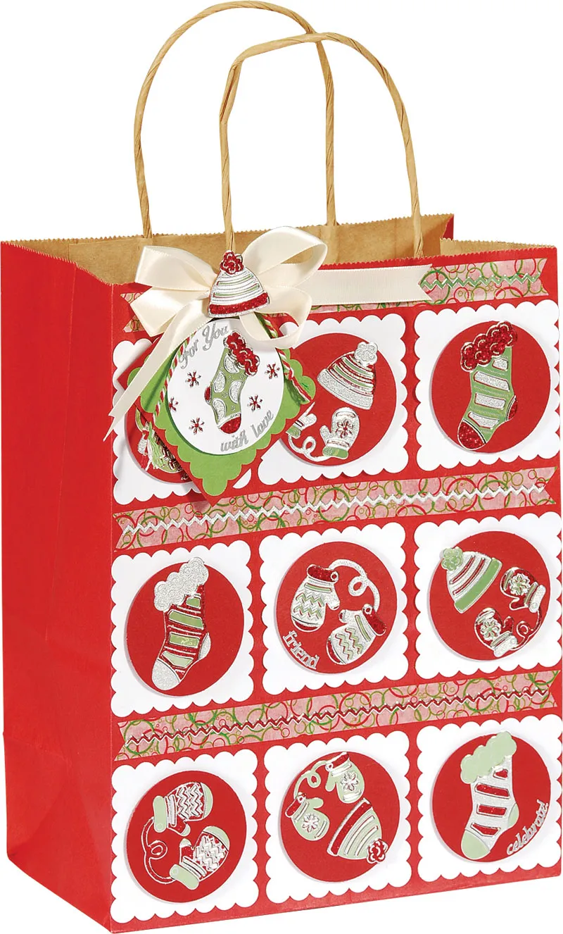 For the bag: Punch nine squares from white cardstock. Glue three across the front of the bag, 1/8" from the bottom. Glue three squares across the top, 7/8" from the upper edge, then glue three more evenly spaced across the center. Cut a 7 7/8" trendy tape length and notch both ends. Place between the bottom and center rows of squares. Cut a 7 7/8" Dazzles red border and place on the tape center. Repeat between the center and top rows, placing a silver border on that tape, and again above the top row, placing a green border on that tape.
