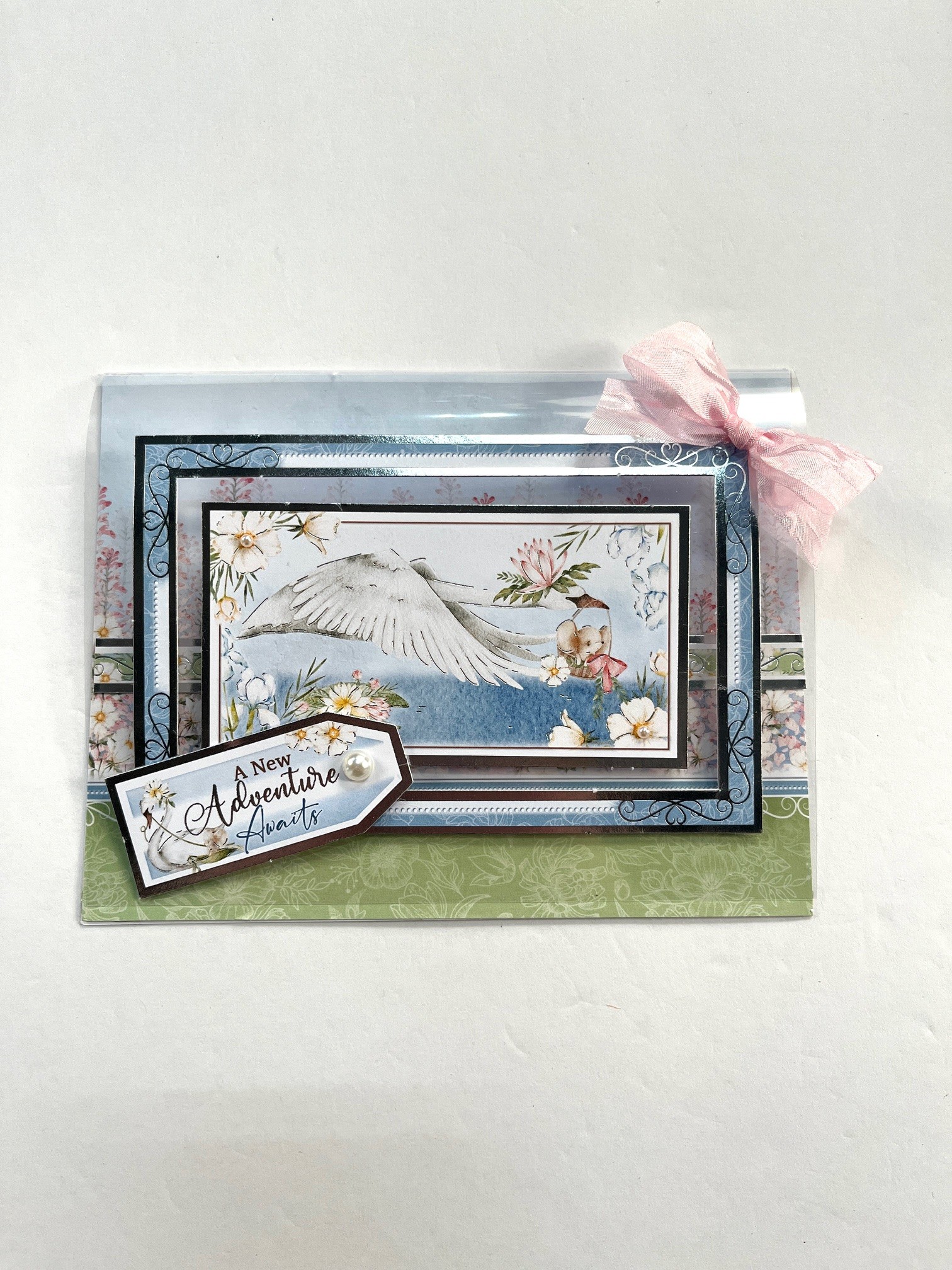 From the “Hello Little One” sheet tape just the outside frame to the center of the acetate. Foam tape the swan to the center. Make and Zot™️ a 2” wide bow from the Light Pink Ribbon Set and place on the top right corner of frame. Tape “A New Adventure Awaits” tag to the bottom left corner. Place pearls as shown.