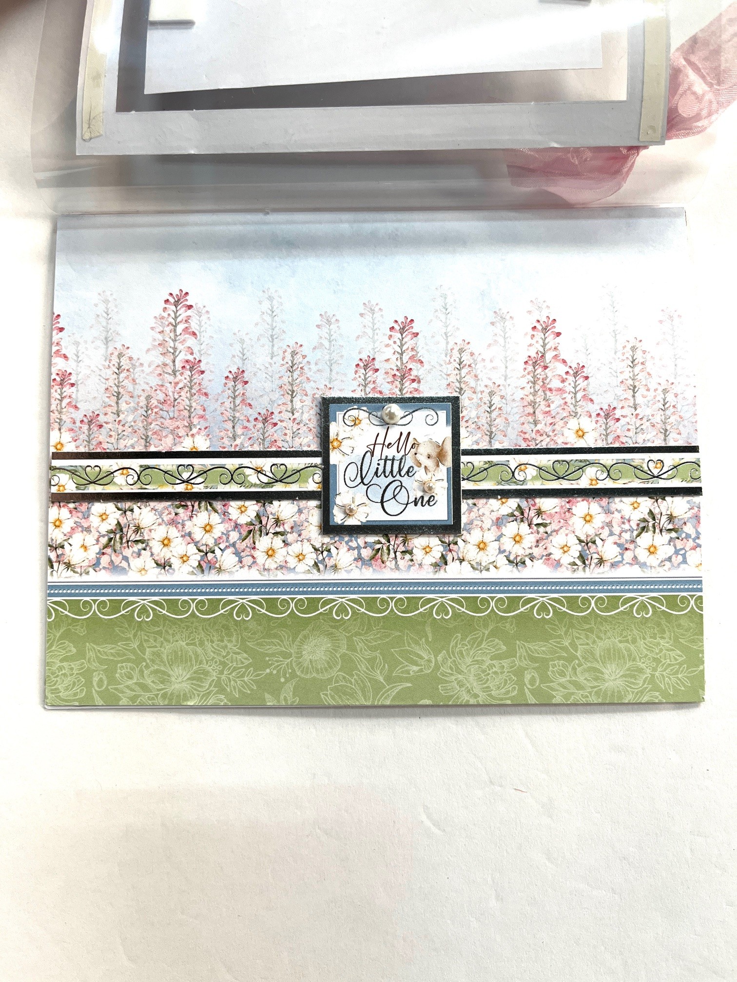 Card Inside: Tape Topper Border 2” from bottom. Tape “Hello Little One” onto the center of the border. Place Pearls as shown.