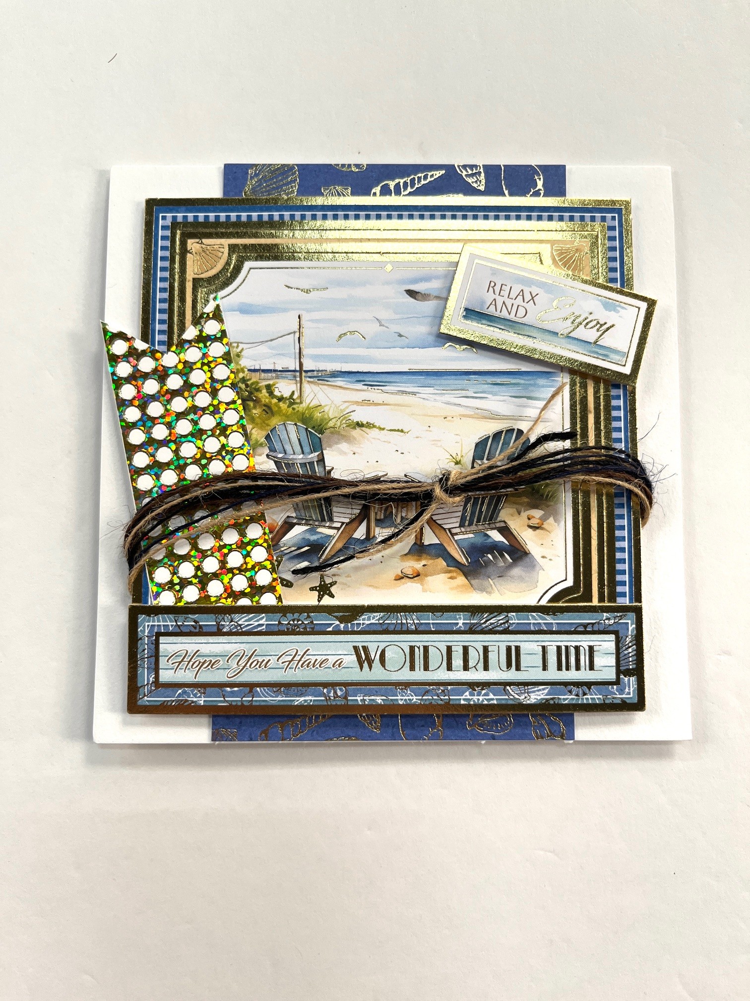 Trim card to 5” square with the fold at the top. Cut 3”x5” strip of the foiled seashells Adorable Scoreable and tape 1” from either side top to bottom. From the “Drifting By” sheet remove all three layers of the topper shown. Wrap twine around the bottom and foam tape to the card. Foam tape “Hope you Have a Wonderful Life” Topper to the bottom of the main Topper. Foam tape “Relax and Enjoy” on the top right. Place a 1”x3” piece of evacuated gold Jewel Dazzles™️ on a 1”x3” piece of paper and trim out as a banner. If you don’t have this Dazzles™️ sheet just omit or substitute with any other cardstock.
