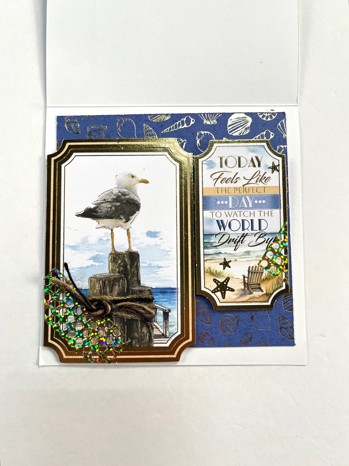 Card inside: Cut a 4 1/2” square of foiled seashells Adorable Scoreable and tape to card center leaving 1/4” white borders. Foam tape seagull Topper and its frame to the bottom and left side. Wrap more gold Jewel Dazzles™️ background sheet on the lower left corner and make a knot of jute and Zot™️ to the Topper. Foam tape “Today Feels Like the Perfect Day to Watch the World Drift By” on the left Add a bit more of the Dazzles™️ sheet to lower right corner.
