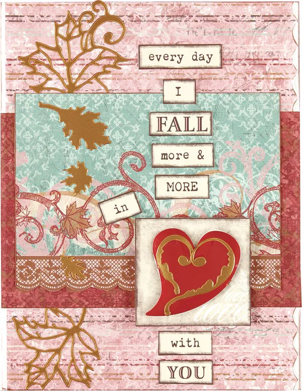 Cut a 3 ¼” wide strip of red patterned paper and glue it across the card, 1 ¾” from the top edge. Cut a 4 3/8”x 3 ¼” rectangle of blue lace scalloped paper. Ink the edges and glue extending 1/4” above the red paper. Adhere small bronze leaves to the left side, lining up with the leaves on the pink paper.