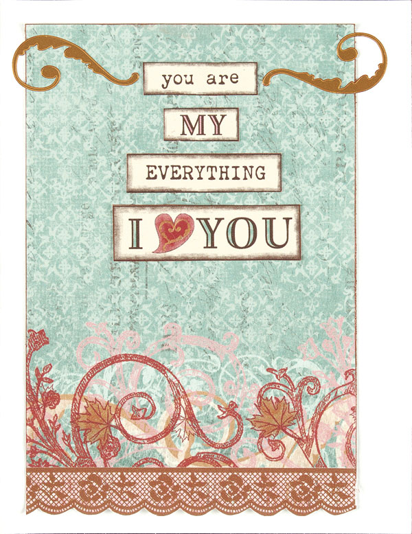 Inside the card: Glue a 4”x6” blue scalloped lace rectangle to the inside back. Glue the greeting words as shown and adhere a bronze swirl on each side.