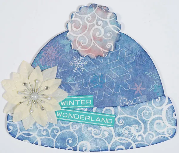 Stack a 2" ivory poinsettia onto a 3" poinsettia and secure with a sparkle burst brad. Glue to the hat brim as shown. Cut out “winter wonderland” and cut the words apart, then glue as shown. Cut a 1¼" circle and place on the sparkle burst brad to protect it. Spray with glitter, remove the circle, and let dry.