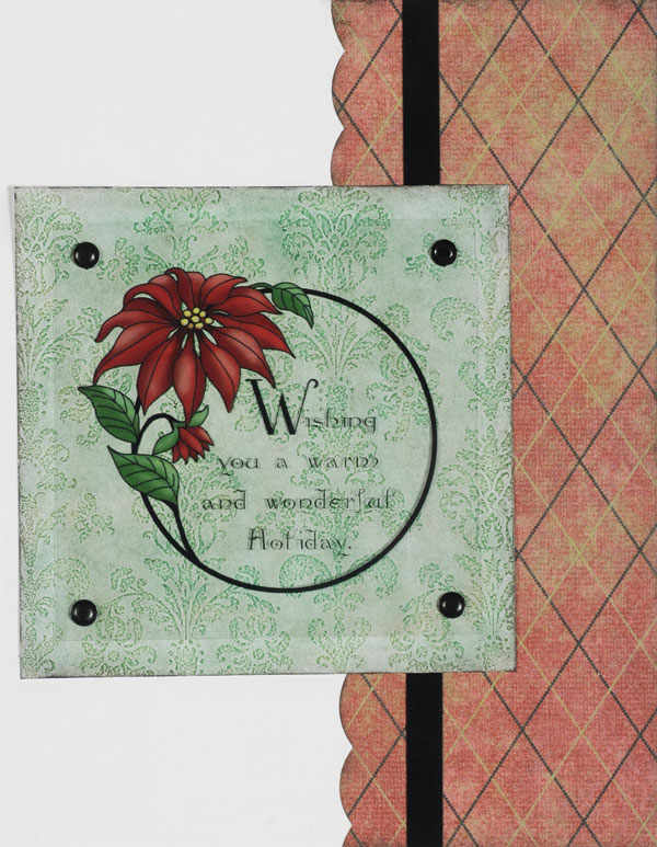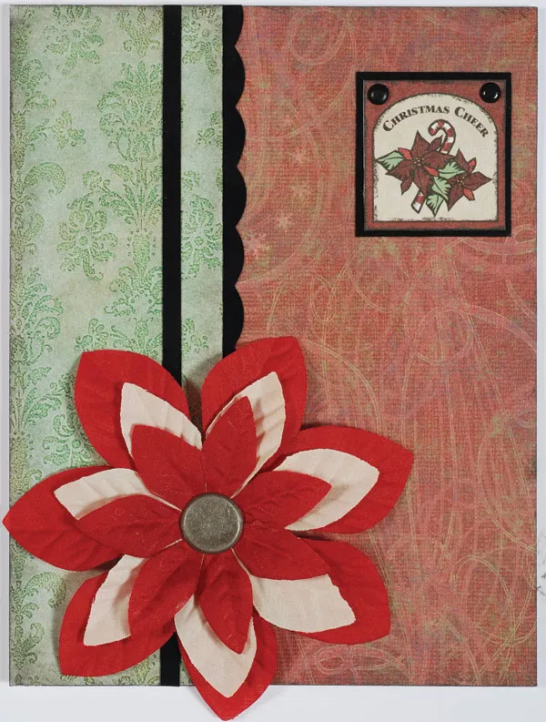 Cut a ¼"x6½" black suede strip and glue to the tapestry paper, 1 ½" from the left edge. Stack a 3¼" ivory poinsettia on a 4" dark red poinsettia. Stack a 2½" dark red flower on top. Secure the stack to the lower area between the black strips using a 5/8" antique silver brad. Cut out the “Christmas Cheer” art, ink the edges, and mat on black suede with 1/16" borders. Glue at the upper right, then insert a mini brad on each side as shown.