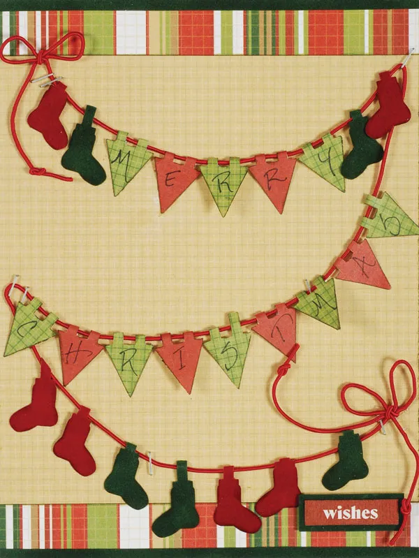 Punch red and green mesh paper banner shapes and write a letter on each, spelling “Merry Christmas.” Ink the edges, then attach them to the thread as shown, gluing in place. Punch red and green suede paper socks. Ink the edges and attach and glue them to the thread as shown. Glue the constructed front to the card. Cut out “wishes” paper ribbon art, ink the edges, and mat on green suede paper with 1/16" borders. Foam tape to the card as shown.