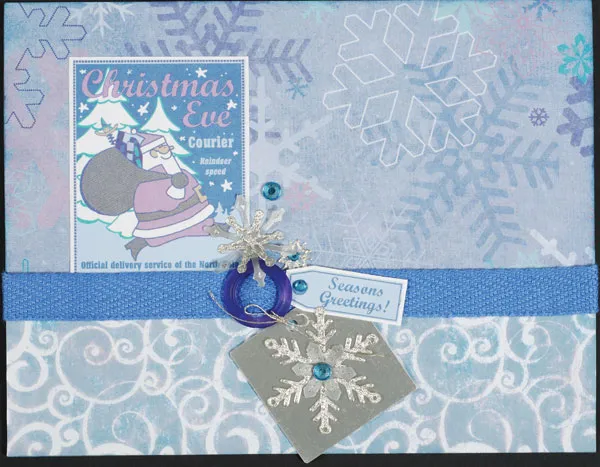 Cut out the courier art and mat on white with 1/32" borders. Glue as shown, tucking the lower edge under the twill. Tie the silver tag onto the ribbon slide with thread, finishing with a shoestring bow. Zot™ the tag to secure. Place a 1½" Dazzles™ snowflake on the tag. Cut out the “Season's Greetings” tag and mat on white with 1/32" borders. Glue to the twill, tucked under the slide. Place a 1" and a 3/8" snowflake above the slide as shown. Place 3mm crystals on the smallest snowflake and the small tag. Place 5mm crystals on the two larger snowflakes.