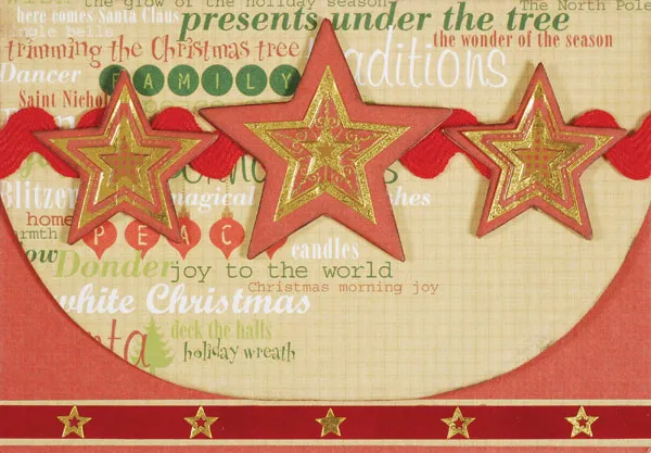 Cover the three chipboard stars with red mesh paper and ink the edges. Place a 1½" Dazzles™ star on each chip star. Foam tape the stars over the rickrack, positioning the largest star in the center.