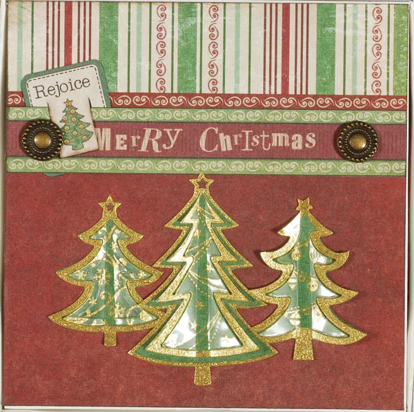 Place a 2½", 2", and 1¾" Dazzles™ tree on green textured paper. Cut around the outer edge, then glue them to the lid as shown. Bend the tree sections upward, adding dimension.