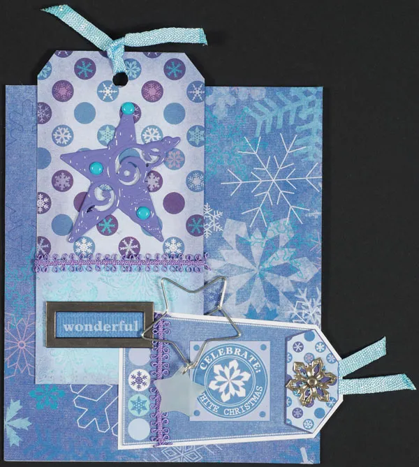 Cut out the darker snowflake tag and wrap purple double loop fiber across it as shown, gluing the ends at the back. Fold a 3" glimmer ribbon and glue to the tag back. Attach a silver snowflake mini Brad Buddy&trade,; then mat the tag on white cardstock. Cut out and glue the “celebrate” snowflake art, then glue the tag near the lower edge, extending right as shown.