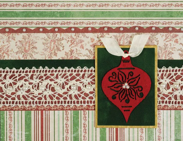 Cut a 2"x2¼" green suede paper and mat on gold with 1/16" borders. Glue a felt ornament in the center then place three 3mm pearls in the center. Knot a 2½" ivory ribbon and glue at the top. Foam tape the ornament to the card as shown. Place 3mm pearls on the scallops. Glue 5mm pearls on the lace, ¼" apart.