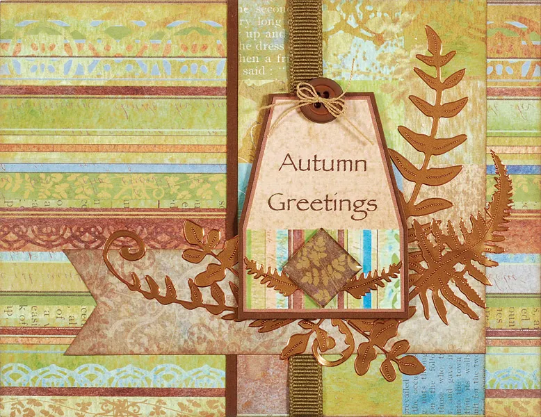 Place Dazzles™ ferns in a cluster radiating from the ribbon and banner as shown. Print the greeting onto the Nature’s Watercolors tag. Mat on cardstock with 1/16" borders, then foam tape over the ferns as shown. Place small fern Dazzles™ on the tag as shown. Follow the manufacturer’s directions to make a square epoxy shape using a brown square from the Nature’s Watercolors squares paper. Place as shown. Glue a button to the tag, then hold two threads together to tie a bow and glue to the button.