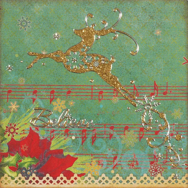 For the card front: Turn the card with the fold at the top and trim to 5"x5". Cover the front with Vintage Christmas corner paper, placing the design as shown, then ink the edges. Place the reindeer and “believe” Dazzles™ on the card, then place swirls, snowflakes, and dots around it as shown.