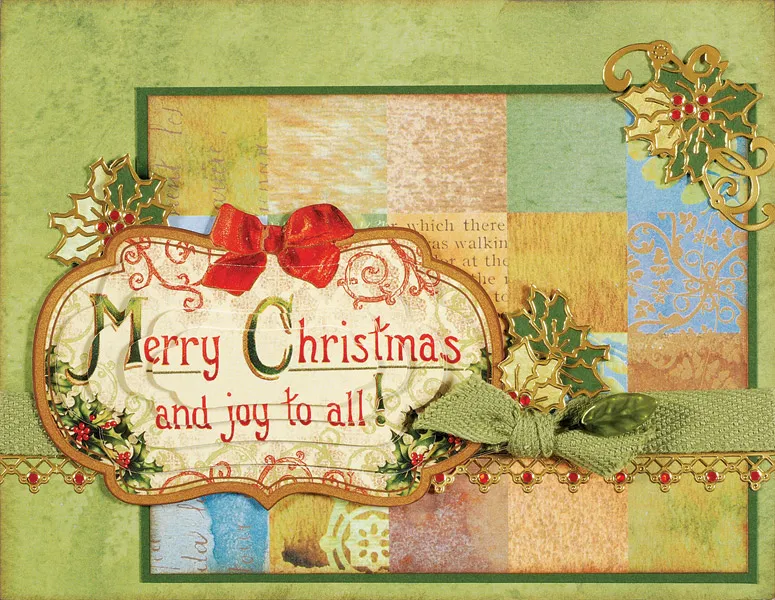 Punch out the label pyramid pieces and follow the package directions to assemble, placing foam tape between the layers. Foam tape over the twill ¼" from the left edge. Knot the remaining twill and glue just right of the pyramid, then insert the leaf pin, tucking the sharp end under the pyramid. Place Dazzles™ holly clusters on cardstock and Nature’s Watercolors watercolor paper and cut around the edges. Glue to the front and place jewel Dazzles™ as shown.