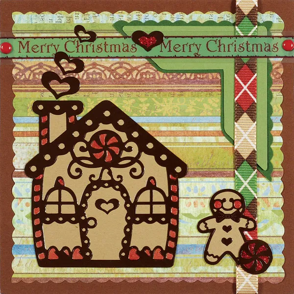 Place the house and small gingerbread man Dazzles™ on tan cardstock and cut around the edges. Glue as shown. Color areas on both with Smooch ink as shown. Place a heart and peppermint candy Dazzle™ on the background of the Merry, Merry Dazzles™ and cut out. Place on the front as shown.