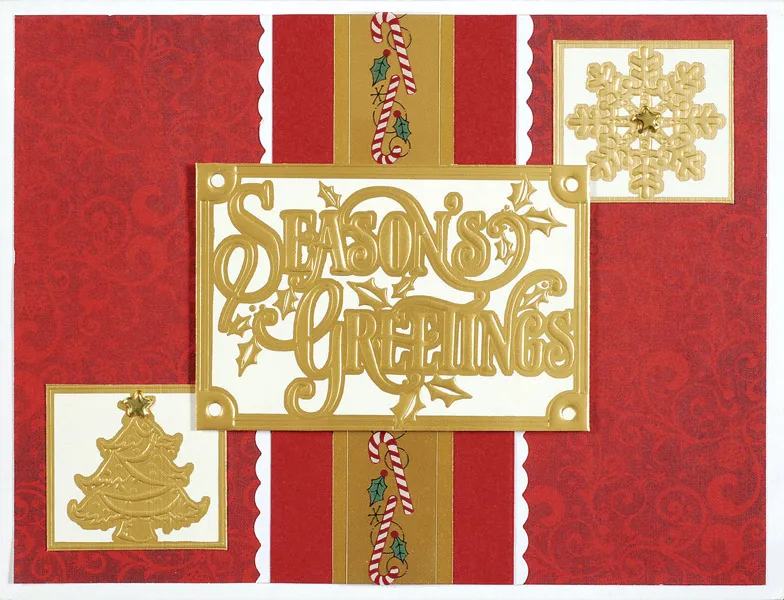 For the card front: Turn the card with the fold at the top. Cut 6¼"x4¾" Vintage Christmas red paper and glue centered on the card. Cut 2"x4¾" red cardstock and mat the long edges on white cardstock with ¼" borders. Trim with the scallop-edged scissors, then glue centered on the red paper. Cut 1"x4¾" gold paper and glue centered on the red cardstock. Cut a 4¾" long candy cane acrylic border and glue the center to the gold strip. Cut out the embossed gold images. Foam tape “Season’s Greetings” to the center. Insert a star brad in the tree and snowflake embossed images, then glue as shown.