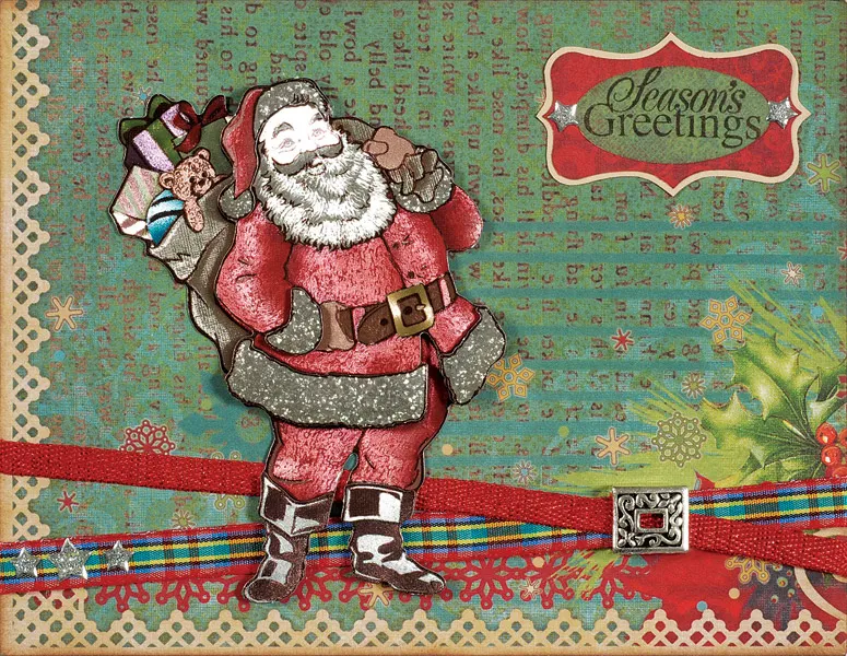 Punch out the Saint Nick die-cuts and follow package directions to assemble with foam tape between the layers. Glue as shown. Punch both labels from Vintage Christmas red and green papers. Stamp “Season’s Greetings” on the green oval, then glue to the red rectangular label. Ink the edges, then mat on cardstock with 1/32" borders. Glue to the upper right and place star Dazzles™ as shown.