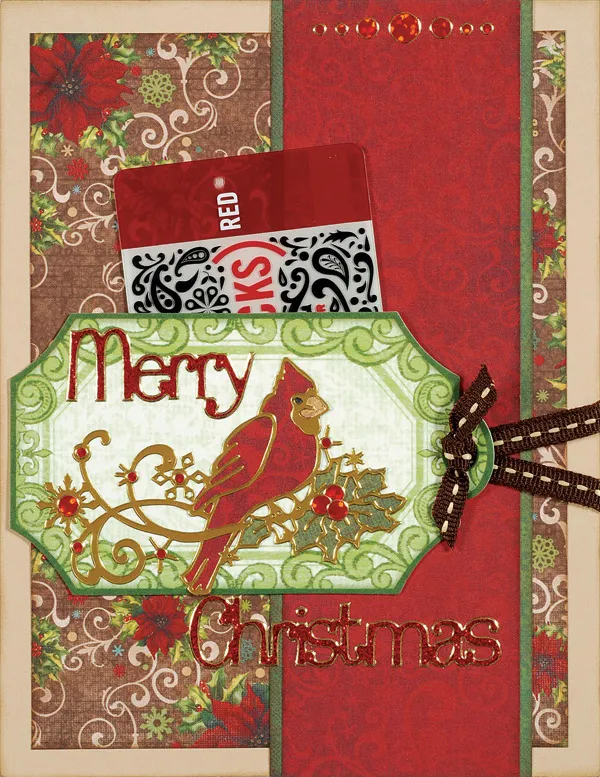 Cut the ¼" stitched grosgrain ribbon in half, then tie two ends together. Insert the long ends through the green tag and pull the knot to the tag hole. Place tape on the tag back along the side and bottom edges. Place the tag and glue the ribbons to the front as shown, tucking the ribbon ends under the cardstock. Secure the remainder of the cardstock. Back the cardinal with Vintage Christmas red paper and holly leaves with Vintage Christmas green paper, cutting around the edges. Glue to the tag. Place the Dazzles™ as shown and tuck a gift card in the pocket. Color the beak with orange ink and the eye with black.